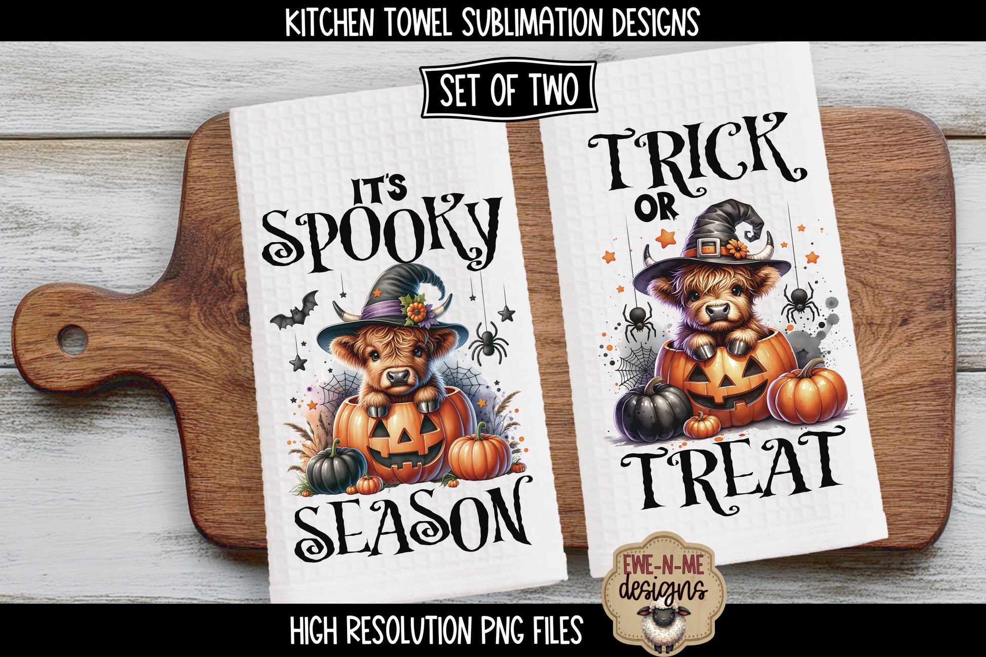 Halloween Highland Cows with Spiders - Kitchen Towel Sublimation Designs